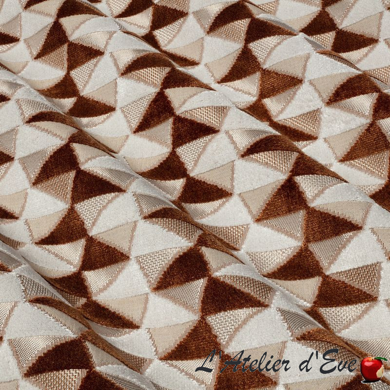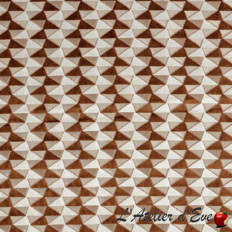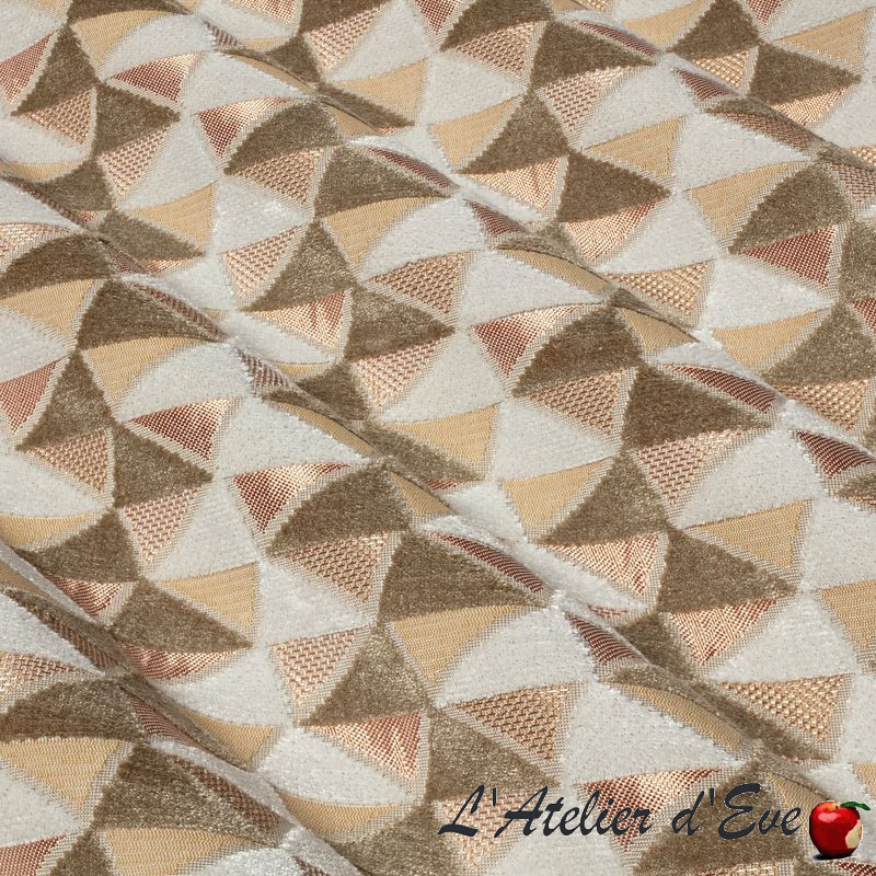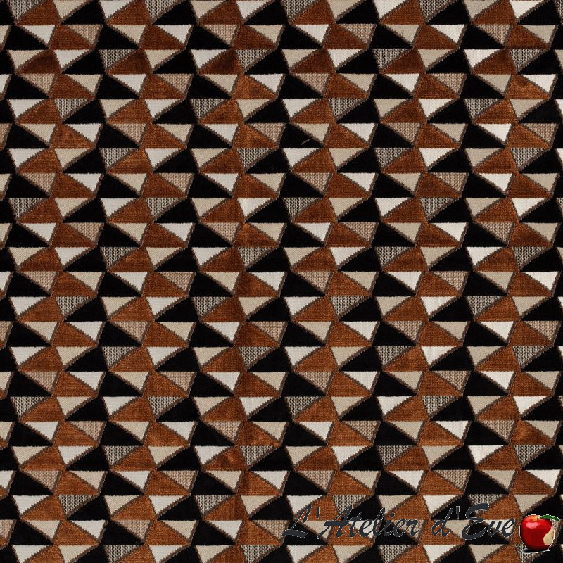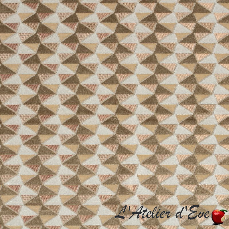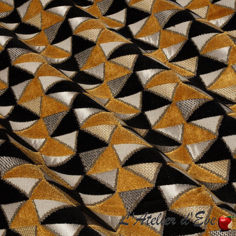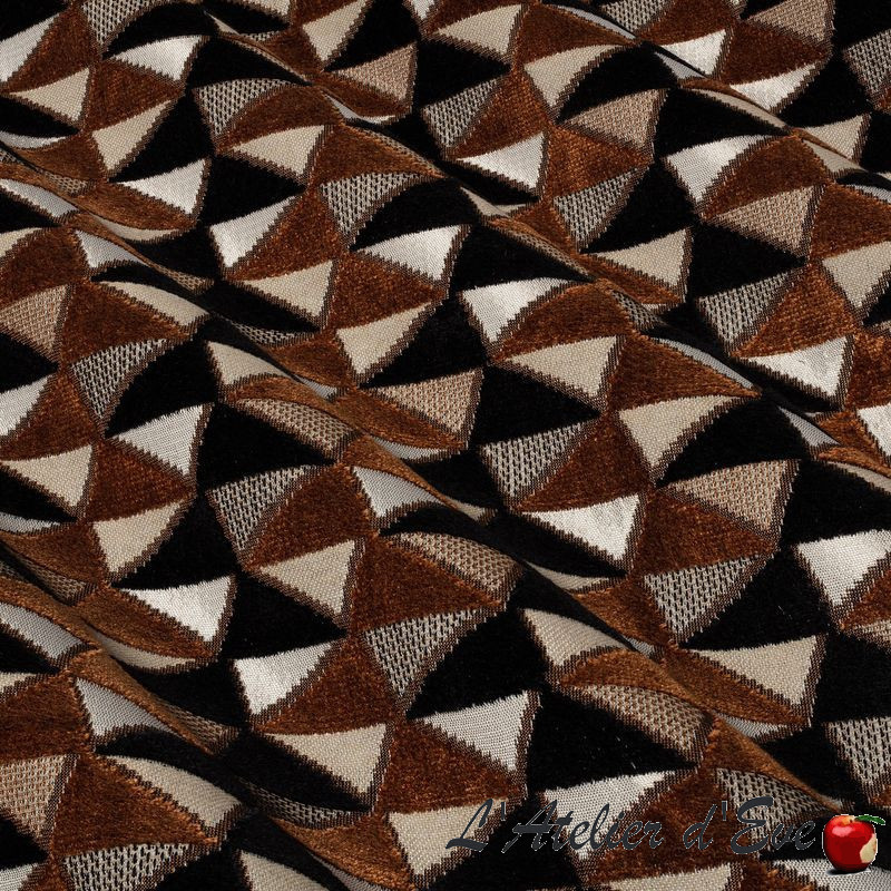 Woven in jacquard blending several materials and embellished with velvet, Charlotte explores the games of geometry and all the richness of yarn work. The triangular patterns are enhanced by subtle shadow effects that highlight the edges. The collection is available in six colours: a bluish palette (green/black), a golden yellow tone (gold/black), a grey version (beige/black) and three natural harmonies (beige/white, bronze/white and bronze/black), to create varied atmospheres.