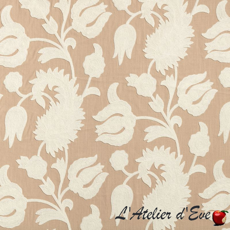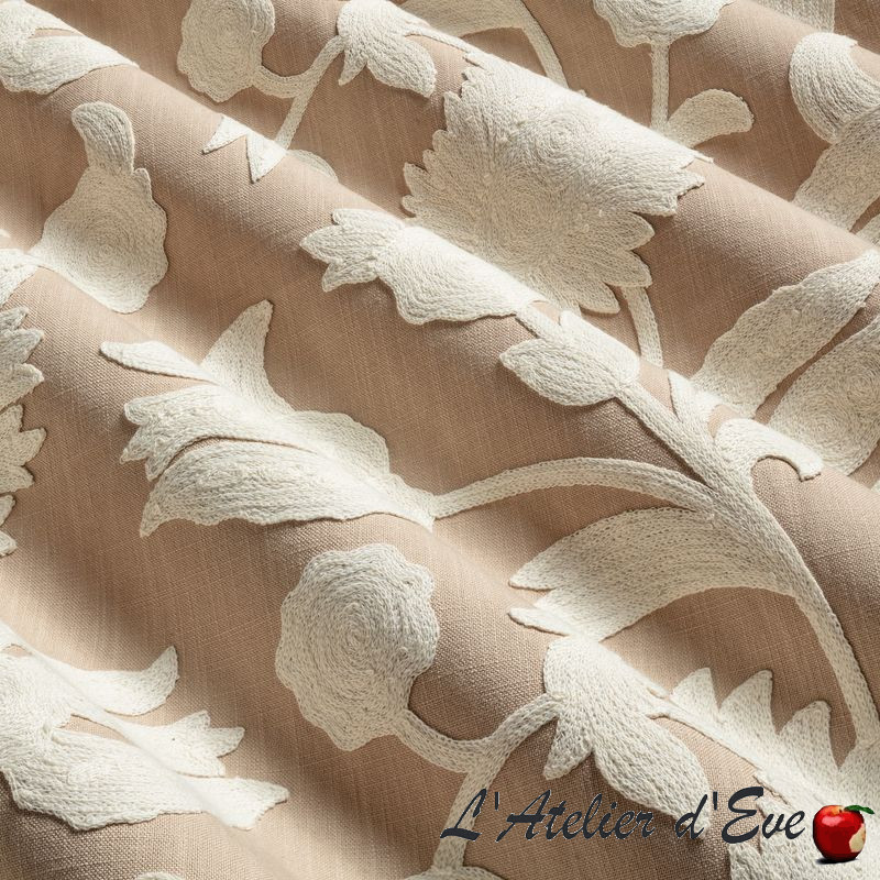 Available in two essential colours, Florence embroidered blends craftsmanship and modernity in a generous cotton decoration embroidered on linen with luxurious rusticity. The large and dense patterns give a 3D thickness, a full and lively hand, a warm effect. On the flip side of the digital age, this model pays tribute to the authenticity of materials and know-how. The ornamentation is obvious and expressive, while cultivating softness of hues and serenity.