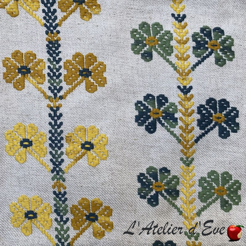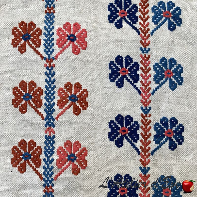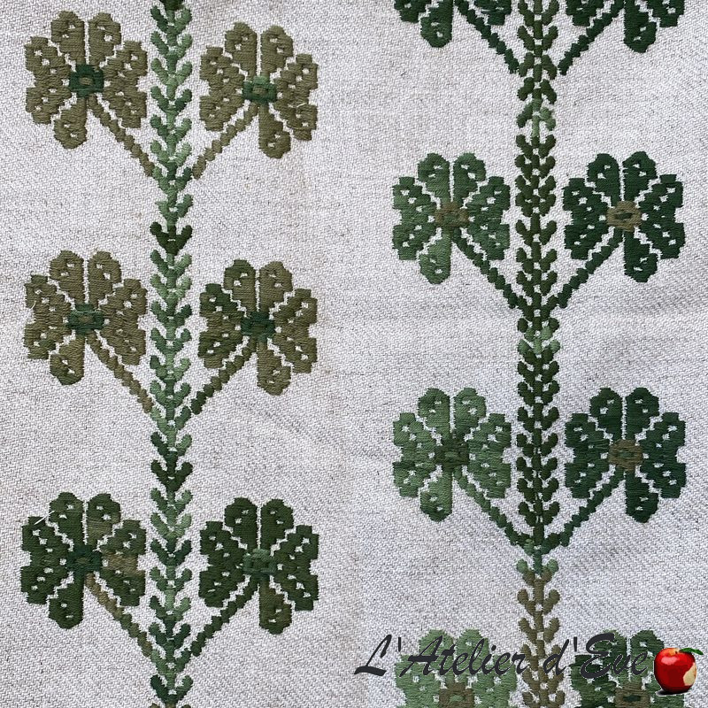 Designed by Casa Lopez for Thévenon, the Embroidered Coup de Chance model is a 100% cotton embroidery with traditional wide stitches, representing cheerful multicoloured clovers. These patterns come to life on a fabric combining viscose and linen, in a refined linen spirit. Each yarn is distinguished by its irregular shades, as if dyed at random, adding a naive and outdated charm. A creation full of optimism, ideal for warm and authentic interiors.