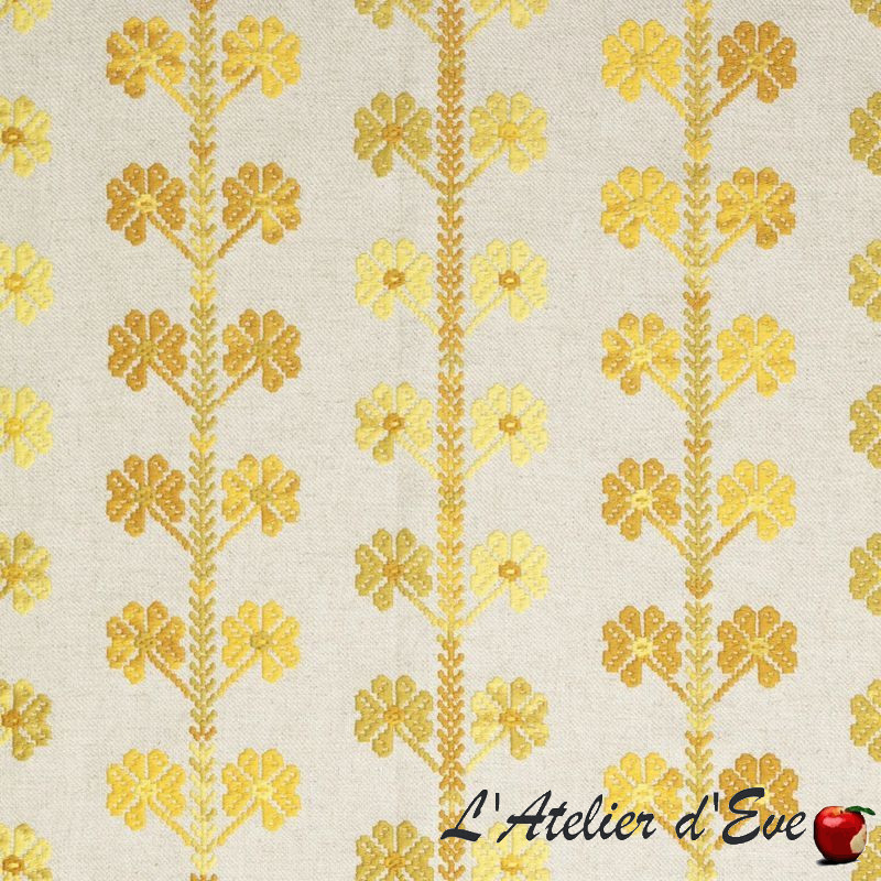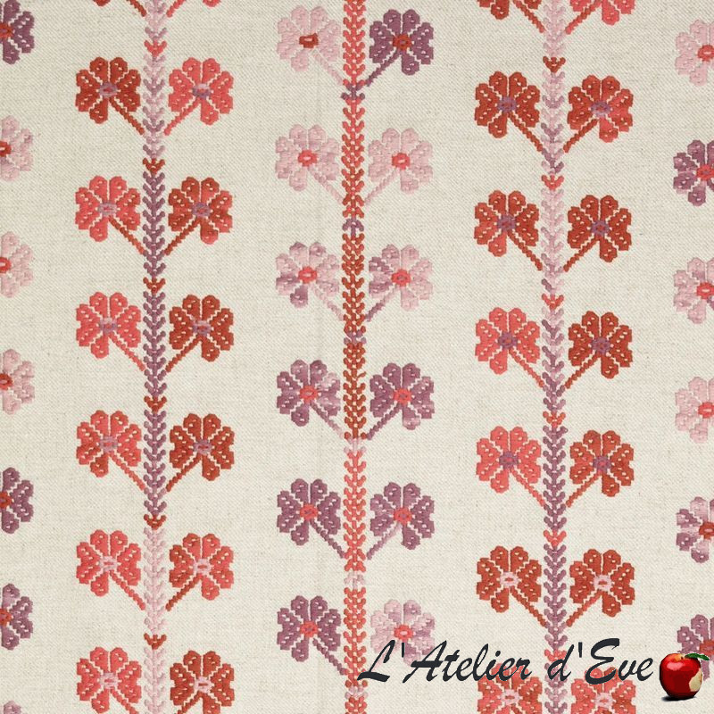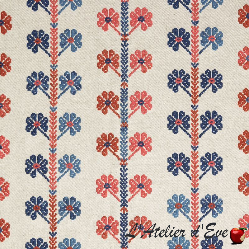 and extremely vibrant tones. For its new collection of fabrics, Cas Lopez transposes emblematic textiles from the countries of Eastern Europe, in a Norman garden. This crossover of influences gives rise to fabrics with extremely vibrant patterns and tones.