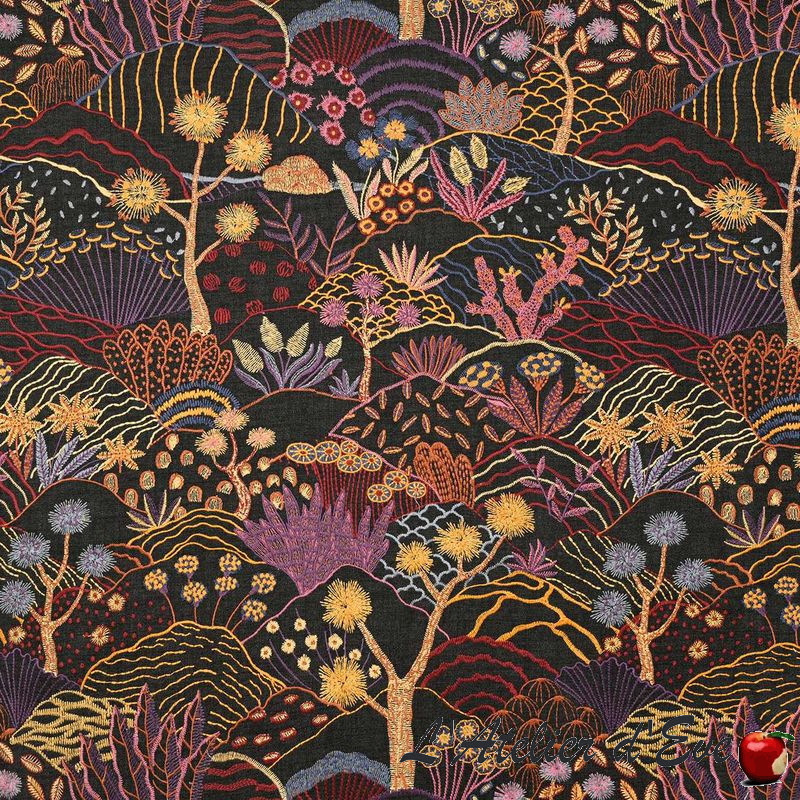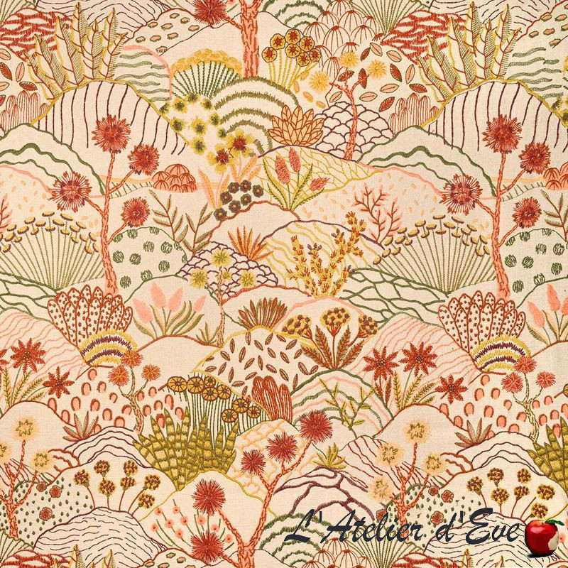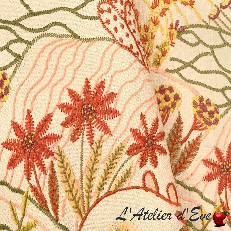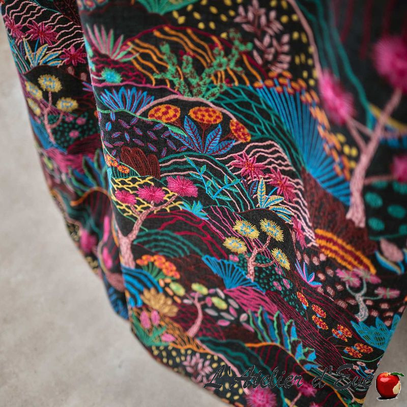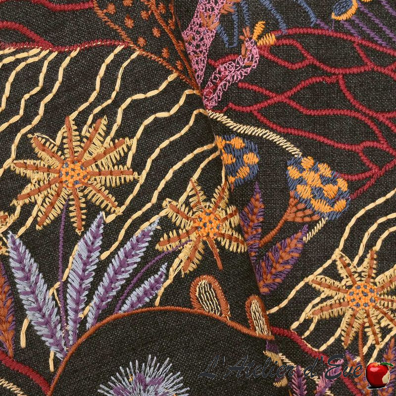 Une pure merveille pour ce tissu aux multiples broderies faisant naître un paysage de dunes où d'innombrables fleurs s'élèvent dans toute leur splendeur, leurs couleurs comme un superbe feu d'artifice.
