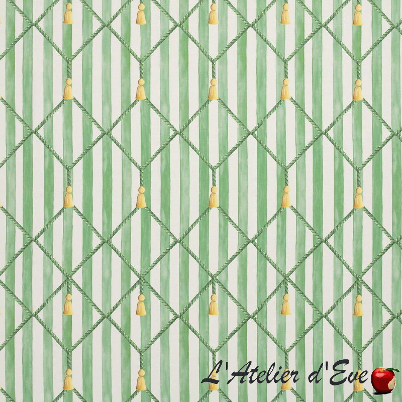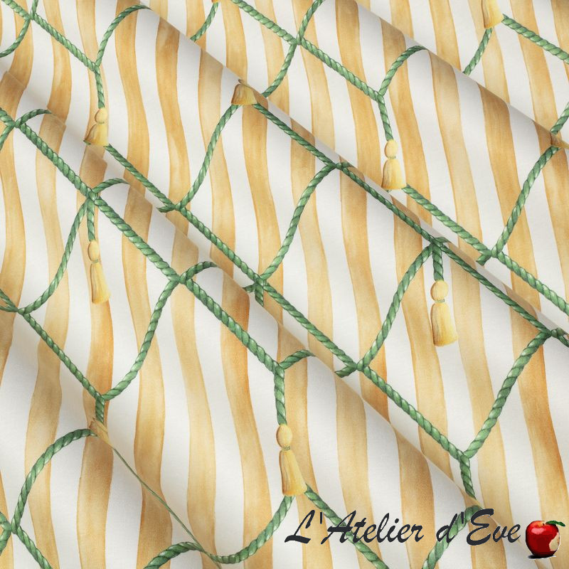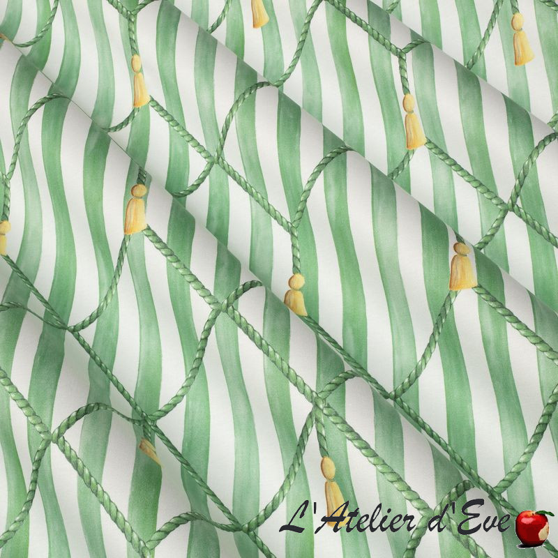 Quelle élégance, quel raffinement pour cette percale satin de coton Les Pompons, une décoration riche, originale, pleine de fraîcheur assurée avec ce motif rayures et ces superbes pompons formant une jolie treille.