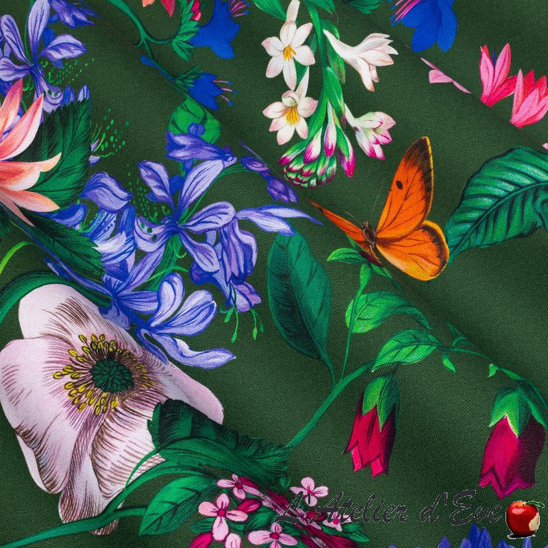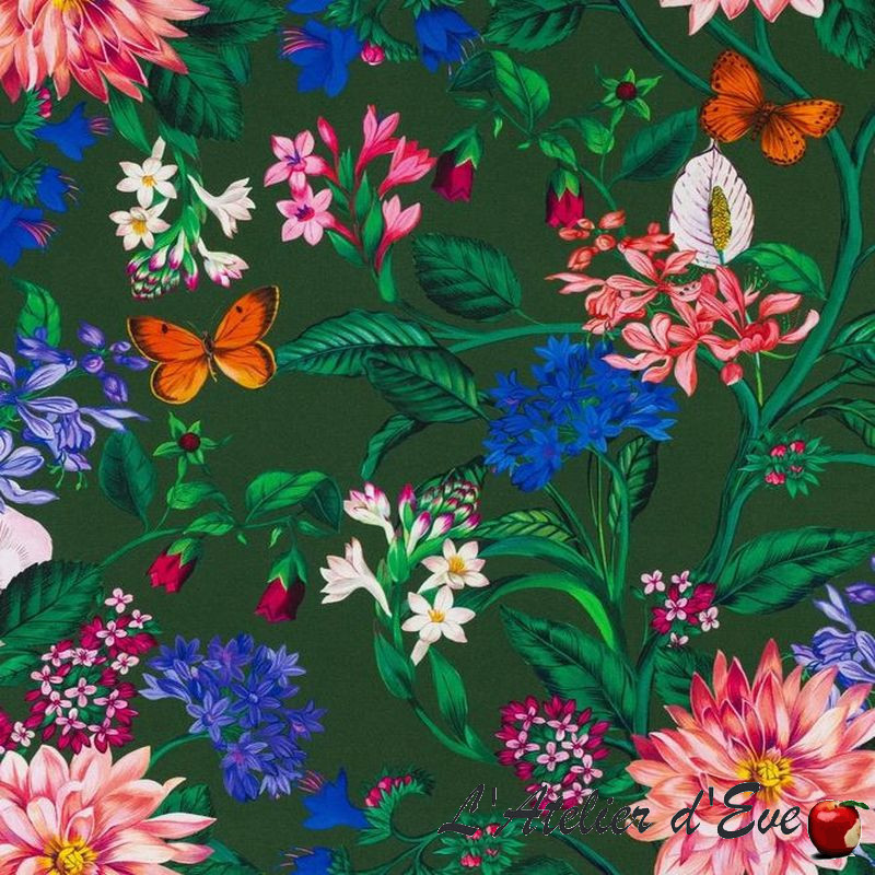 Un imprimé fleuri où se mêlent fleurs, dahlias, anémones, cyclamens, glaïeul d'Abyssinie et papillons dans des éclats de couleurs qui sauront illuminer votre intérieur et amener une belle énergie.