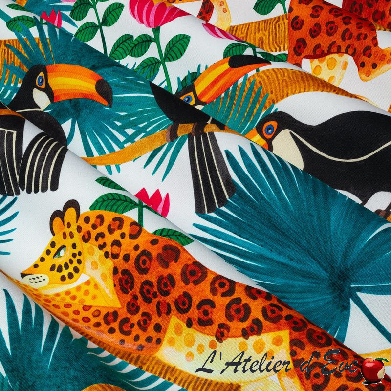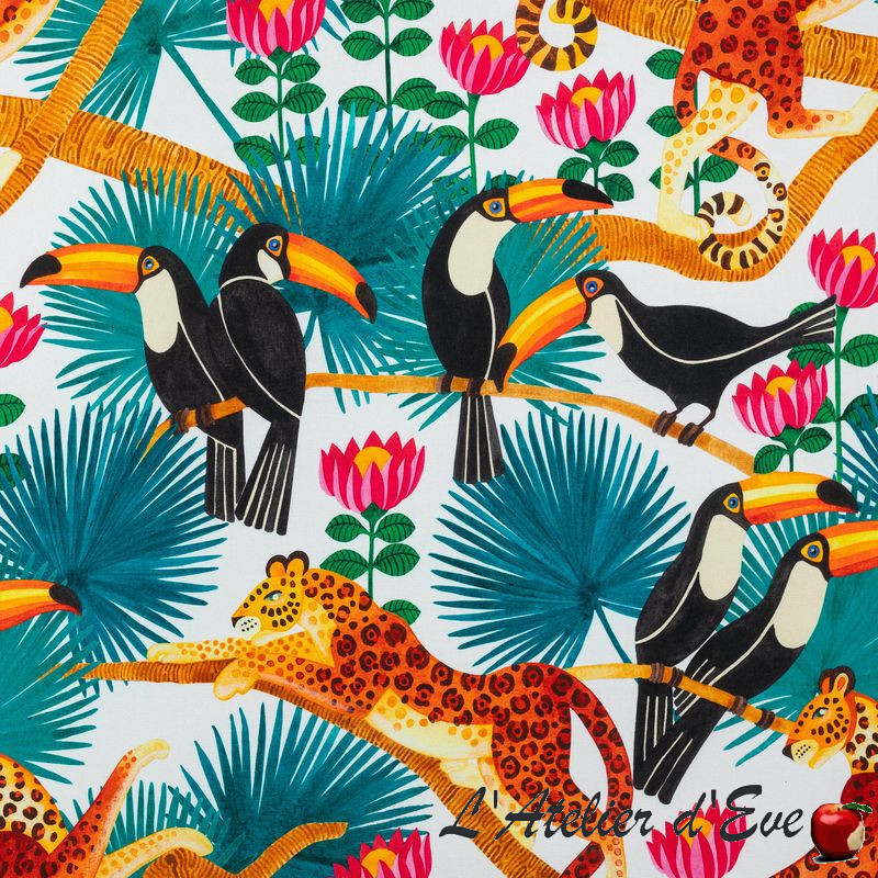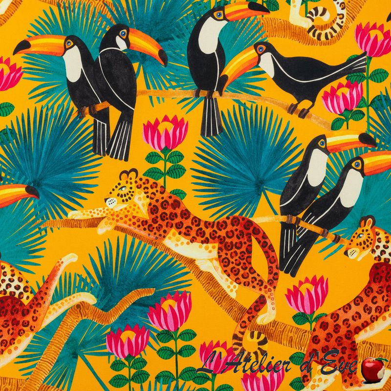 Toucans couleur smoking et léopards vêtus de leurs merveilleux motifs naturels (rosettes ou ocelles) se partagent la scène, avec pour arrière plan feuilles de palmiers en éventails et fleurs rose affriolantes. Un imprimé exotique au style illustration pour des intérieurs rayonnants et narratifs.