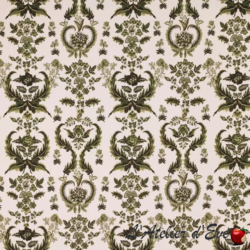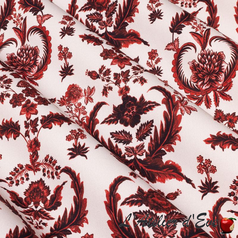 Le fond écru est un atout fraîcheur pour ce tissu en percale de coton Madame Clélia d'un grand raffinement, à la rencontre des styles "Grands siècles" aux coloris rouge et vert, symboliques des jardins.