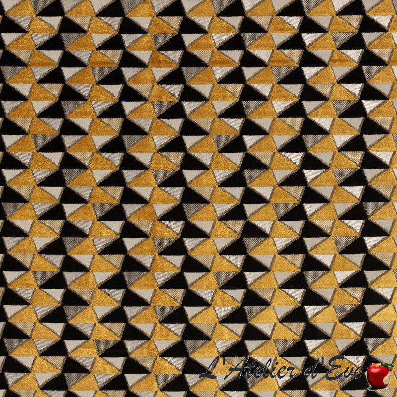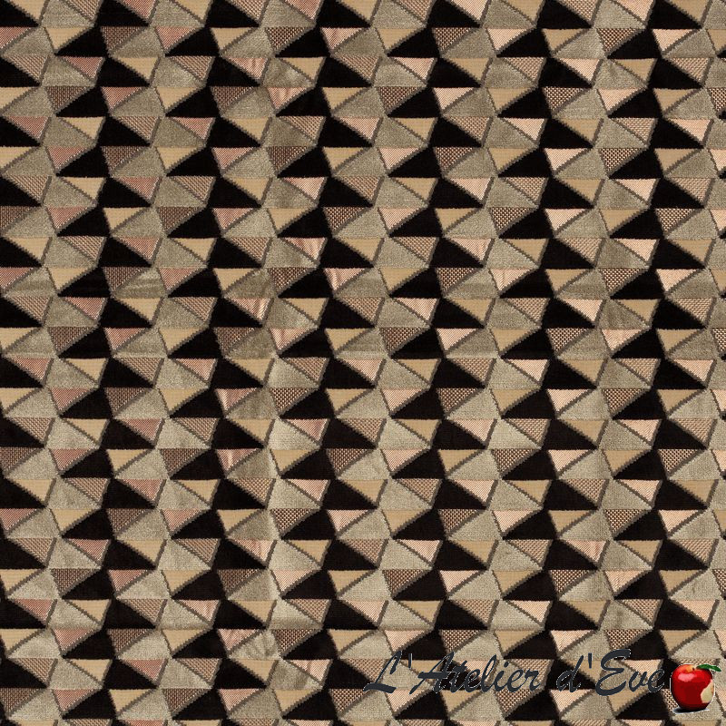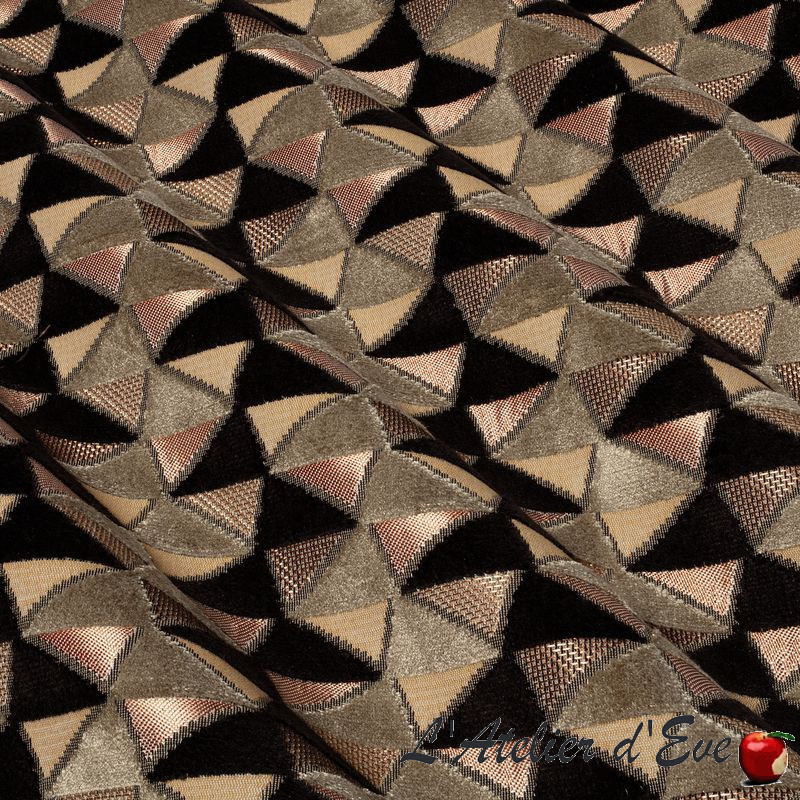 Un jeu de triangle mêlant plusieurs matières et un grand travail au niveau du fil. Des effets d'ombres viennent souligner les arêtes et donner de la profondeur. Une belle palette de coloris avec fils or, argent, cuivre... pour enrichir ce merveilleux tissu Charlotte