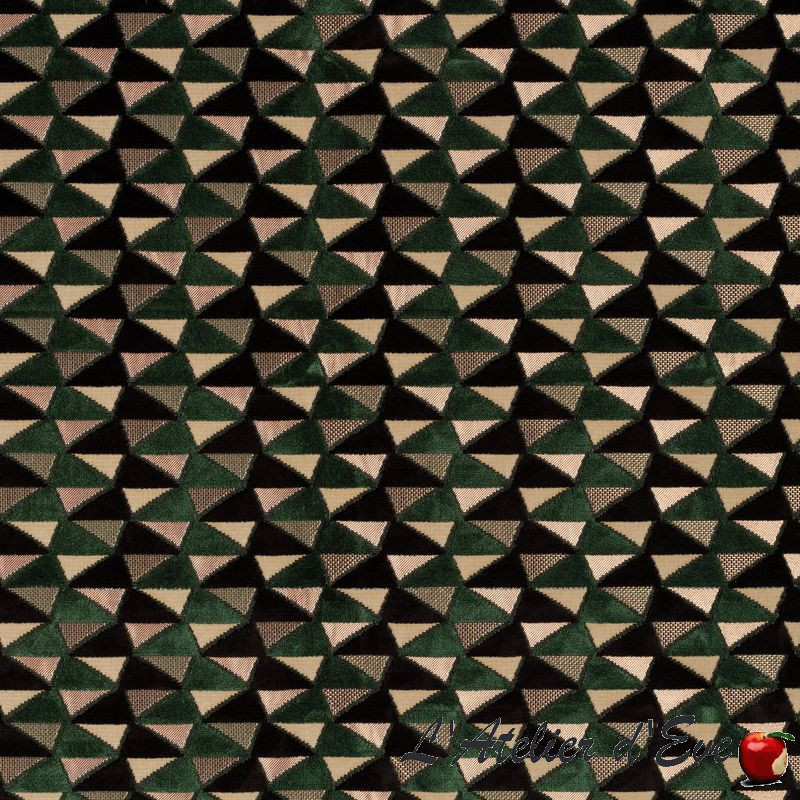 Tissé en jacquard mêlant plusieurs matières et rehaussé de velours, Charlotte explore les jeux de géométrie et toute la richesse du travail du fil. Les motifs triangulaires prennent du relief grâce à de subtils effets d’ombre qui viennent en souligner les arêtes. La collection se décline en six coloris : une palette bleutée (vert/noir), une tonalité jaune doré (or/noir), une version grise (beige/noir) et trois harmonies naturelles (beige/blanc, bronze/blanc et bronze/noir), pour créer des ambiances variées.